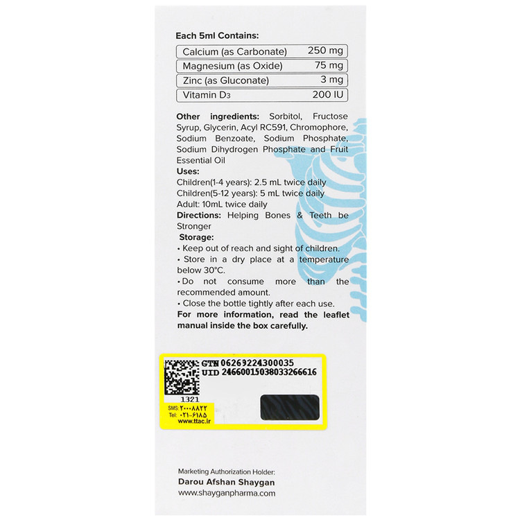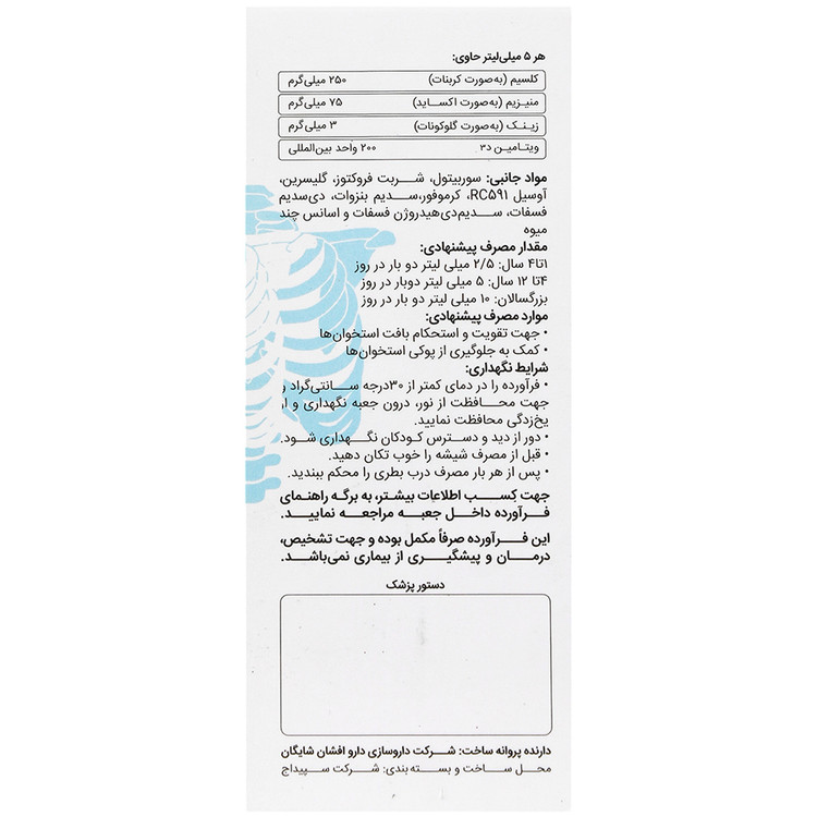- استئوکلسیزین، مکمل تغذیهای به شکل سوسپانسیون خوراکی جهت کمک به حفظ سلامت استخوانها