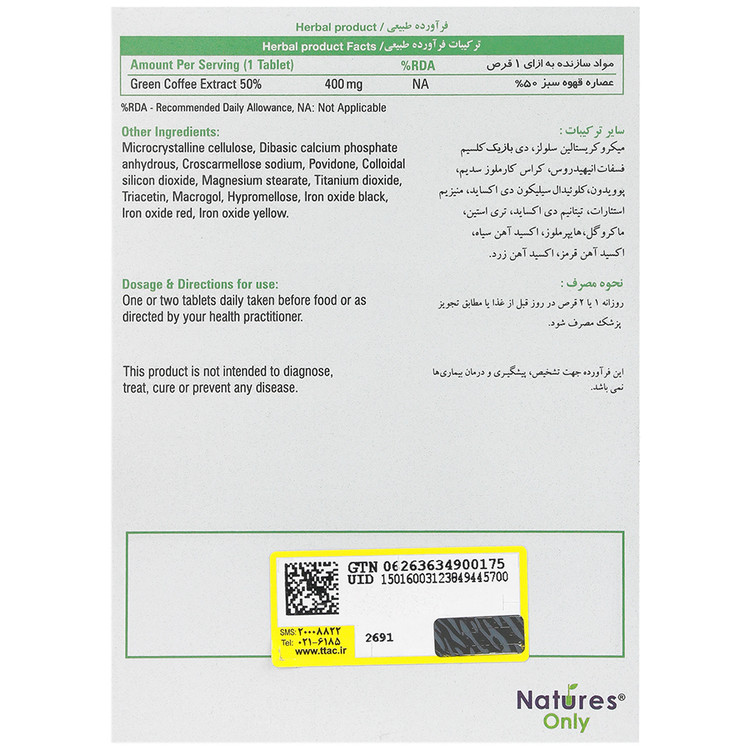 - هر قرص حاوی عصاره قهوه سبز 50% به میزان 400 میلی گرم