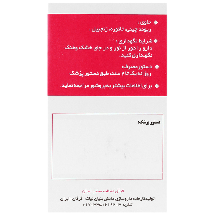- اجزاء فراورده: ریوند چینی، زنجبیل، تاتوره