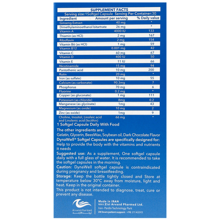 کپسول نرم دایناول یک مکمل شامل مولتی ویتامین، مواد معدنی و جینسینگ است. هر کپسول حاوی عصاره جینسینگ با ویتامین های A، گروه E ،C ،D ،B، نیکوتین آمید و مواد معدنی آهن، کلسیم، مس، منیزیم، روی و سلنیوم است.
