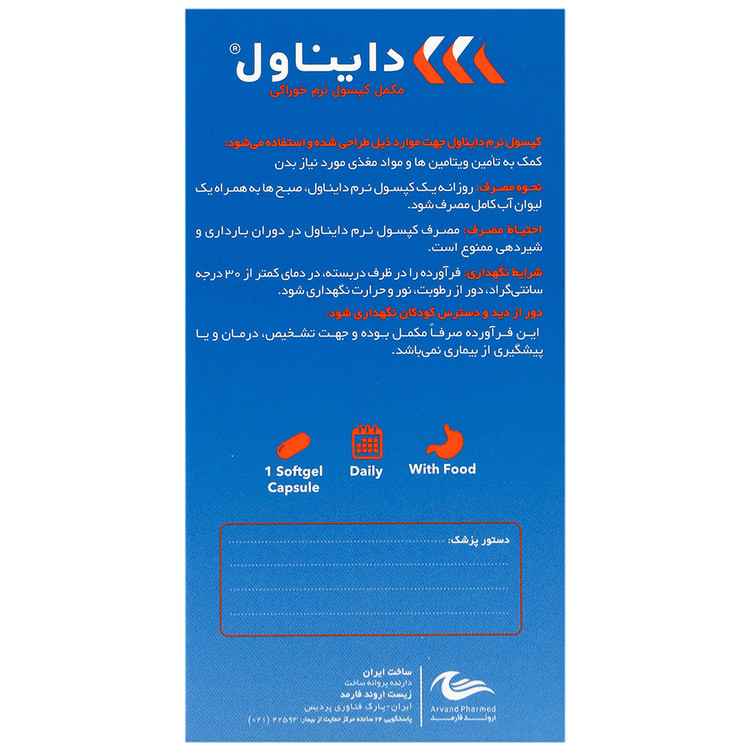 روزانه یک عدد کپسول نرم دایناول، صبح به همراه یک لیوان آب مصرف شود.