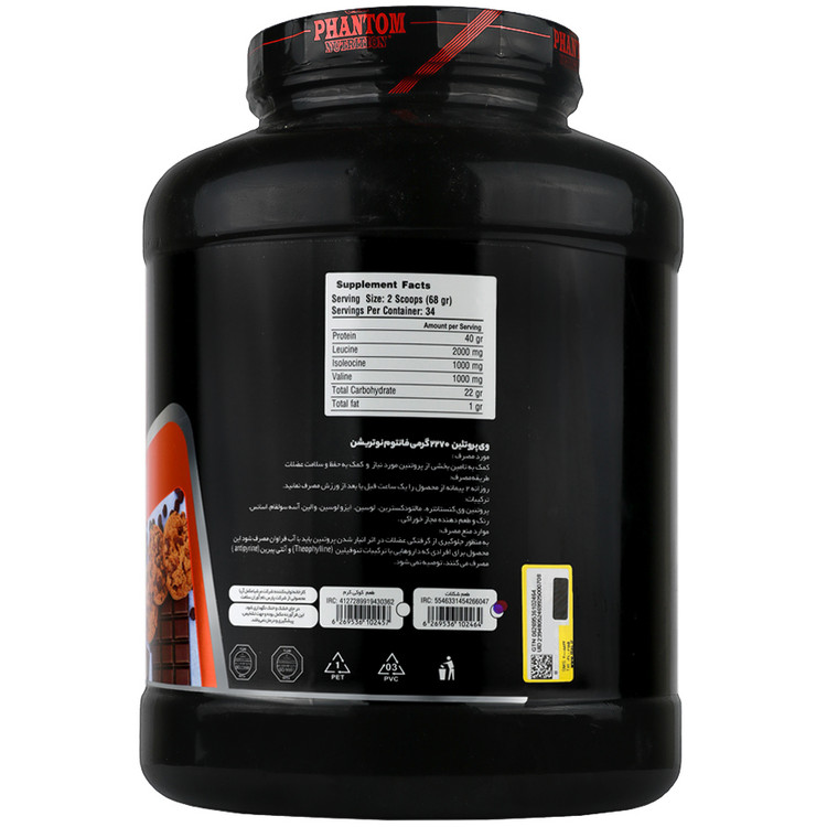 - پروتئین وی فانتوم 2270 گرمی، دارای آمینواسیدهای شاخهدار (BCAA) لوسین، ایزولوسین و والین با نسبت 1:1:2