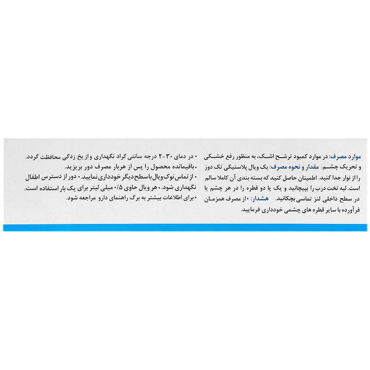- محتوی 30 عدد قطره چشمی 0.5 میلی لیتری در بسته های تک دوز