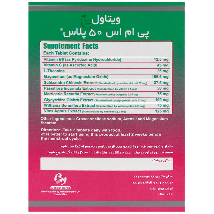 - قرص pms 50 ویتاول، حاوی عصارههای گیاهی به همراه منیزیم، ال تئانین، ویتامین B6 و C