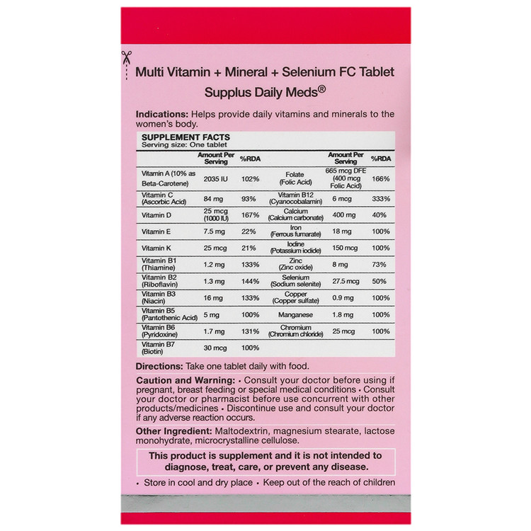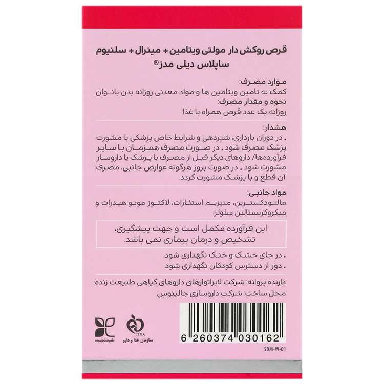 - ساپلاس دیلی مدز بانوان، حاوی مولتی ویتامین در کنار مواد معدنی همراه با دوز مناسبی از سلنیوم
