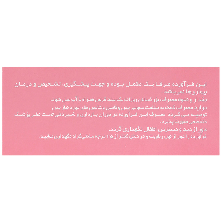 - این فراورده صرفا یک مکمل بوده و جهت پیشگیری، تشخیصو درمان بیماری ها نمی باشد.