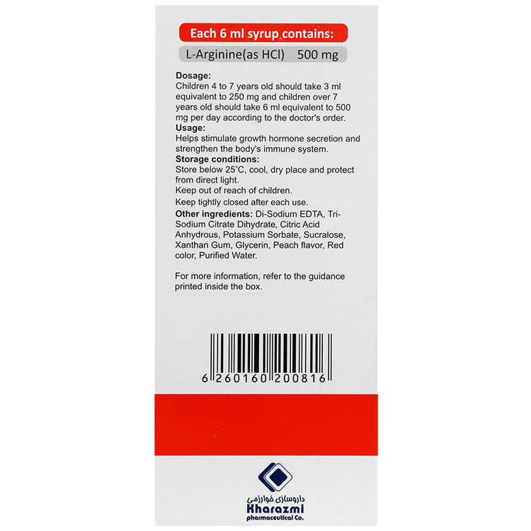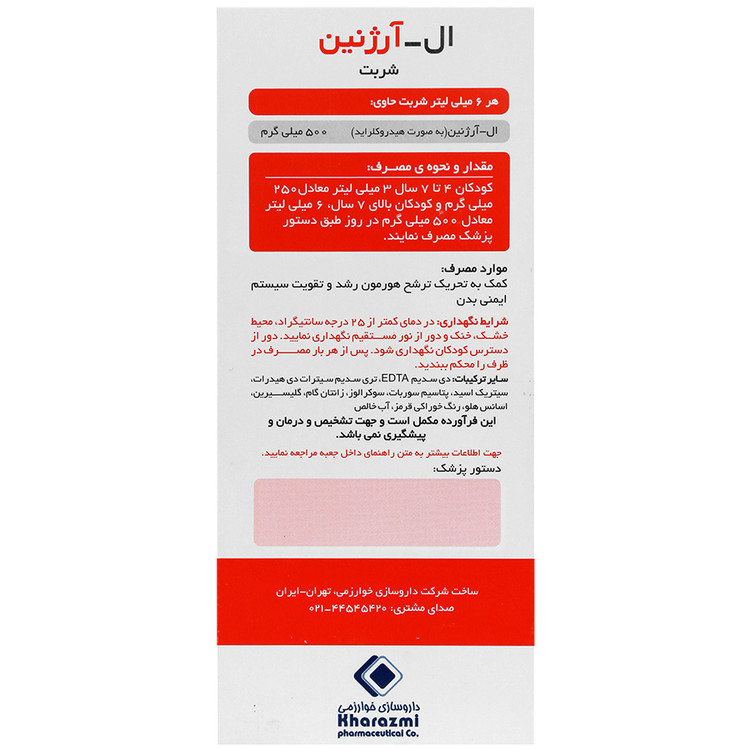 - شربت ال آرژنین خوارزمی، حاوی 500 میلی گرم ال آرژنین به ازای هر 6 میلی لیتر