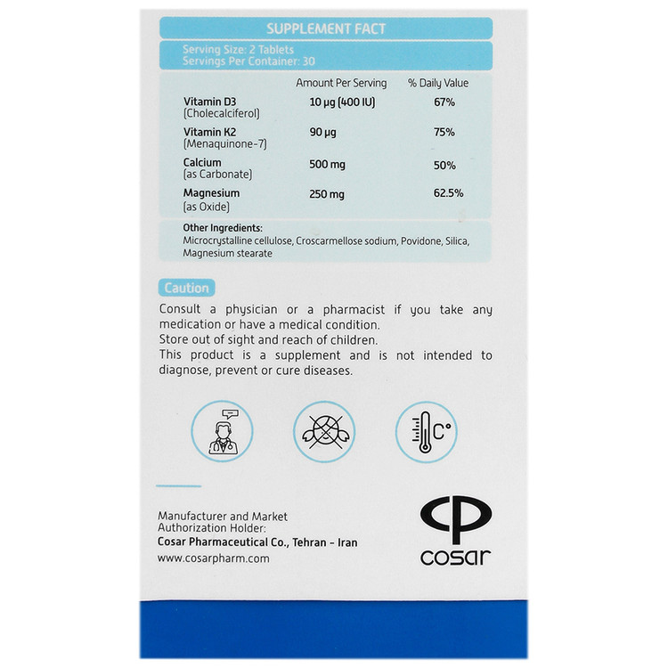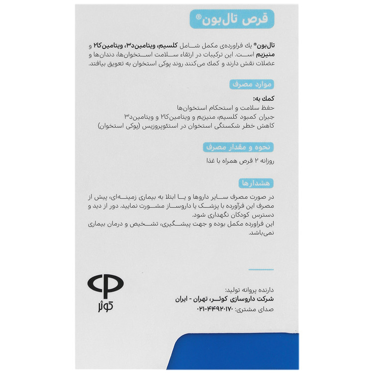 - تال بون حاوی کلسیم کربنات، منیزیم اکساید، ویتامین D3 و K2