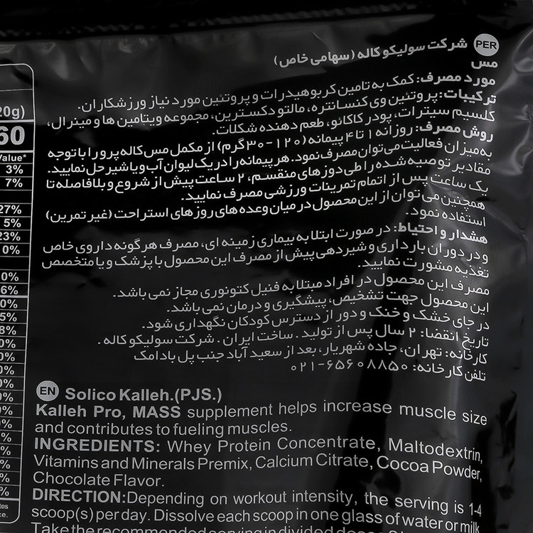 - ترکیبات: پروتئین وی کنسانتره، مالتودکسترین، مجموعه ویتامین ها و مینرال، کلسیم سیترات، پودر کاکائو و طعم دهنده شکلات
