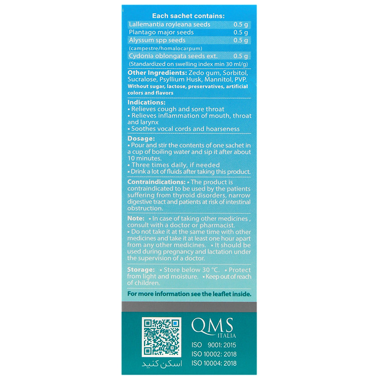اين محصول، مخلوطی از چهار دانه موسیلاژی است که دم کرده آن برای درمان سرفه و التیام التهاب و درد گلو و دهان به کار می رود. ترکیبات موسیلاژی با خواص التیام بخشی، محافظت کنندگی و نرم کنندگی، باعث کاهش تحریکات مخاط و تسکین التهاب می شوند. هیچیک از دانه ها در این فرآورده پودر نمی شوند و بنابراین به طور ایمن، اثر بخشی آن ها فقط از طریق ترکیبات موسیلاژی دانه های کامل بدست می آید. در این فرآورده، نگرانی ناشی از ترکیبات سیانیدی دانه های پودر شده به، وجود ندارد زیرا عصاره موسیلاژی دانه کامل پودر نشده به، جایگزین بهدانه پودر شده در فرمول شده است. از مزایای دیگر این فرآورده آن است که فاقد شکر است و بنابراین برای افراد دارای رژیم های با محدودیت مصرف قند مثل افراد دارای اضافه وزن و یا بیماران دیابتی قابل مصرف است.