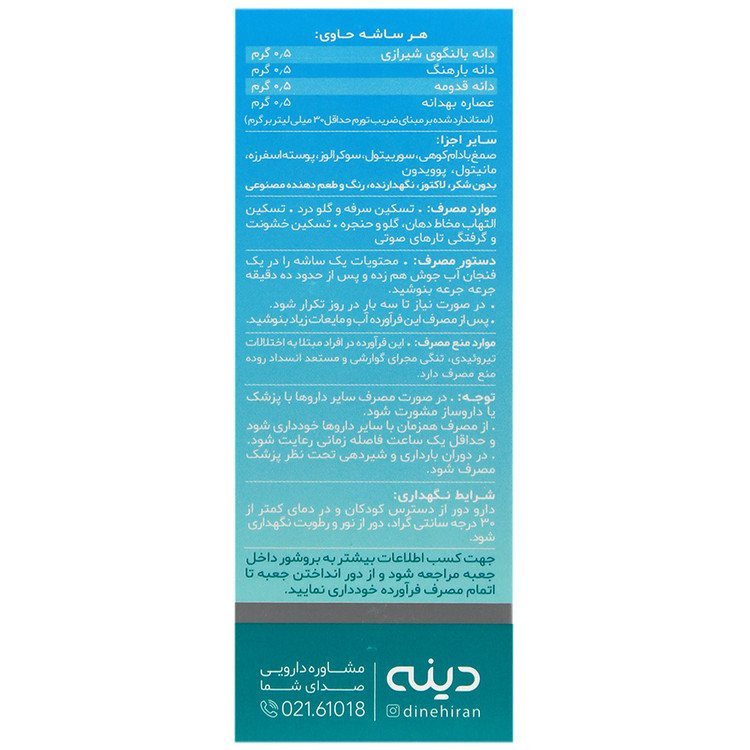 روش مصرف:محتویات 1 ساشه در یک فنجان یا یک لیوان کوچک آب جوش (100 تا 150 میلی لیتر) همزده و پس از حدود 10 دقیقه، جرعه جرعه نوشیده شود. در صورت نیاز تا 3 بار در روز در روز تکرار شود. بعد از مصرف این فرآورده، آب یا مایعات زیاد نوشیده شود.