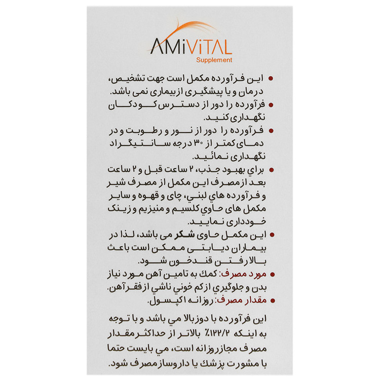 - فروس گلایسین سولفات امی ویتال مکمل آهن حاوی 100 میلیگرم آهن المنتال در هر کپسول
