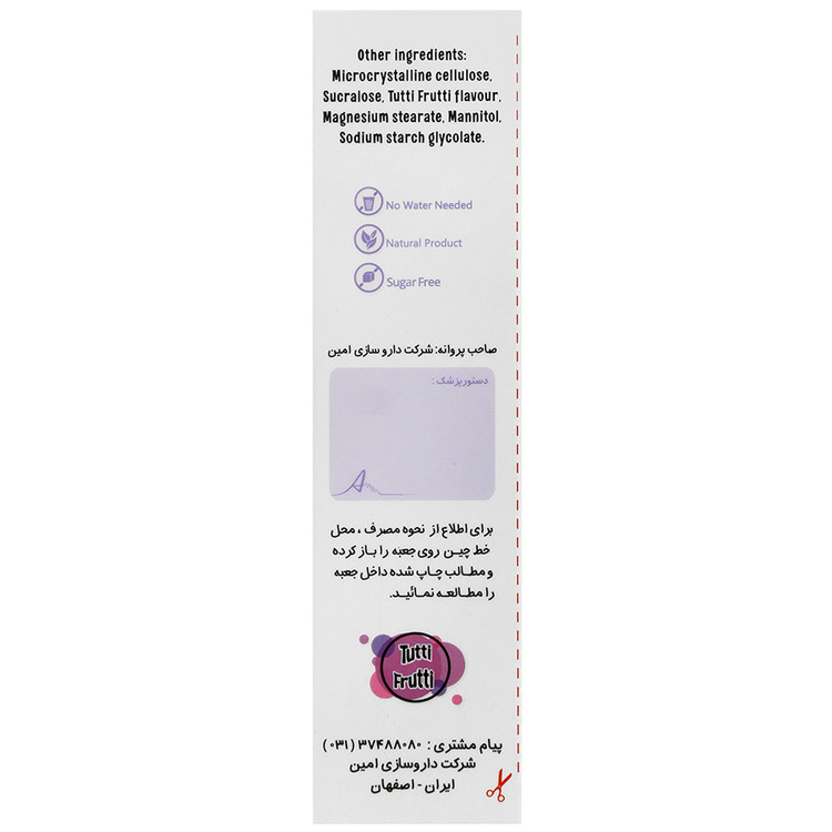 - سایر ترکیبات: سلولز میکروکریستالی، سوکرالوز، طعم دهنده توتی فروتی، استئارت منیزیم، مانیتول، نشاسته سدیم گلیکولات