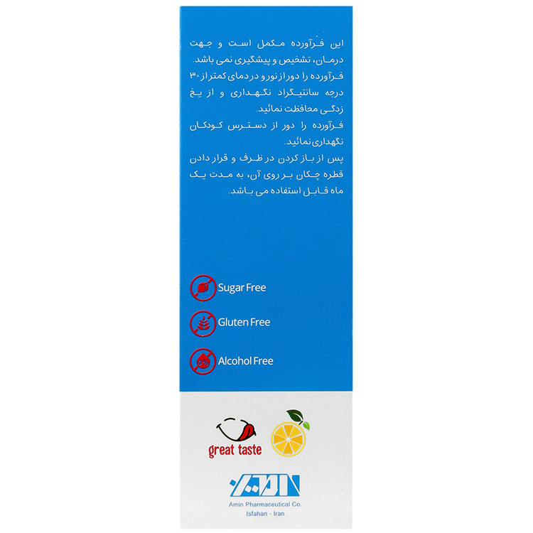 - هشدارها: فرآورده را بیش از مقدار توصیه شده مصرف ننمائید. 4 تا 5 ساعت پس از مصرف این فرآورده از رانندگی یا کار با ماشین آلات خودداری نمائید. پس از باز کردن در ظرف و قرار دادن قطره چکان بر روی آن، فرآورده به مدت یک ماه قابل مصرف می باشد. فرآورده را مستقیما در دهان چکانده و یا با آب یا آبمیوه مصرف کنید. از مصرف این فرآورده بیش از 14 روز، بدون نظر پزشک خودداری نمائید.
