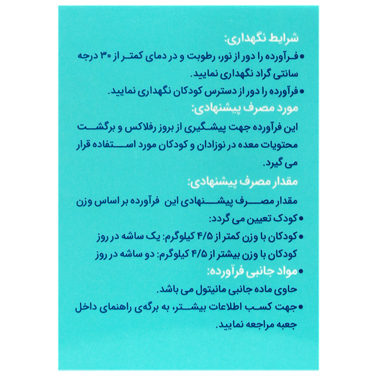 - هشدارها: پیش از مصرف این فراورده در کودکان با ین کمتر از یک سال، با پزشک و یا داروساز مشورت نمایید. مصرف در کودکان بزرگتر از 2 سال، بزرگسالان و سالمندان مناسب نمی باشد. فراورده به صورت همزمان باسایر ترکیبات دارای مکانیسم مشابه مصرف نشود.