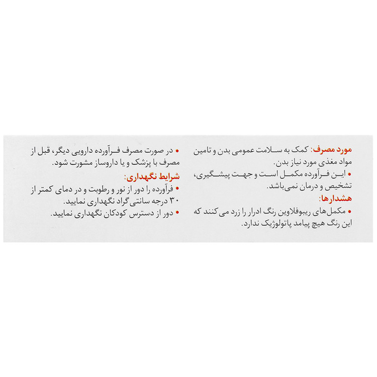 - هشدارها و احتیاطات: مکمل های ریبوفلاوین رنگ ادرار را زرد می کند که این رنگ هیچ پیامد پاتولوژیک ندارد. در صورت مصرف فراورده دارویی دیگر قبل از مصرف با پزشک و یا داروساز مشورت شود.