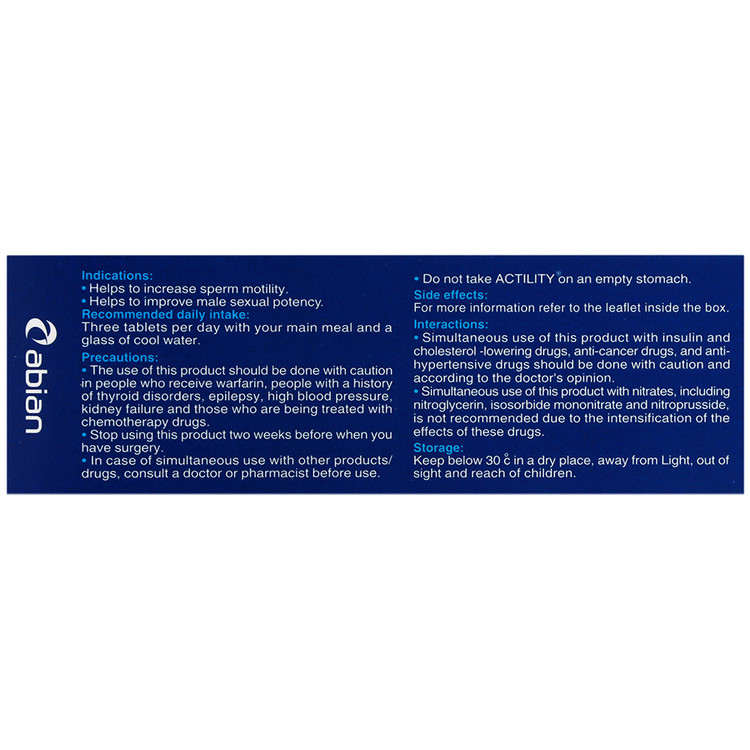 اکتی لیتی به افزایش تحرک اسپرم کمک می کند و همچنین در افزایش میل جنسی آقایان، طولانی شدن زمان نعوظ، بهبود عملکرد فیزیکی بدن، بهبود کیفیت مایع منی و افزایش میزان اسپرماتوژنز (تولید اسپرم) موثر می باشد.برخی ترکیبات موجود در محصول: