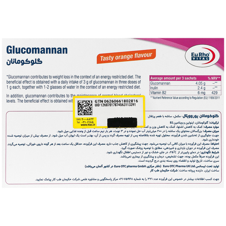 - ساشه گلوکومانان یوروویتال، دارای فیبر محلول گلوکومانان، اینولین و ویتامین B2