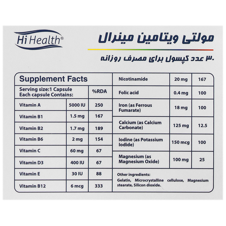 - مواد جانبی: ژلاتین، میکرو کریستالین سلولز، منیزیم استئارات، سیلیکون دی اکسید