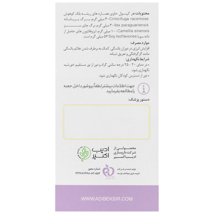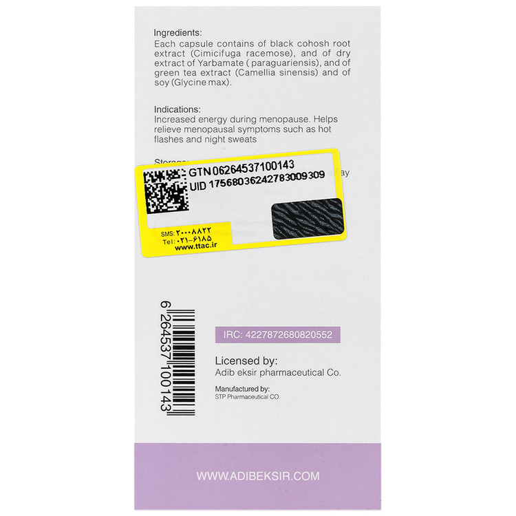 - حاوی ریشه بلک کوهوش، سویا و عصاره خشک برگ یرباماته و چای سبز
