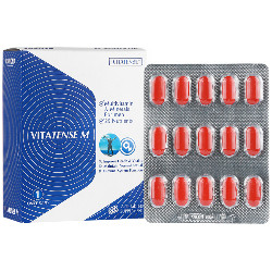 اجزای فرآورده و مکانیسم عمل:ویتاتنس ام با فرمولاسیونی کامل، جهت کمک به تأمین ویتامین ها و مواد معدنی ضروری مورد نیاز بدن در آقایانی که در طول روز فعالیت بدنی شدید دارند، ورزشکاران و افرادی که به هر دلیل دچار کمبود ویتامین ها و مواد معدنی لازم هستند، طراحی گردیده است. علاوه بر آن وجود اجزایی چون جنسینگ، ال آرژنین، ال کارنیتین، ال متیونین و کو آنزیم کیوتن در ترکیبات آن باعث دوچندان شدن نقش این فرآورده در تولید انرژی، بهبود عملکرد ذهنی و جسمی می شود.ویتامین های گروه ب: برای حفظ سوخت و ساز طبیعی بدن، سلامت پوست، مو، کبد و چشم ضروری هستند.ویتامین سی: به عنوان آنتی اکسیدان، سیستم ایمنی بدن را تقویت می کند و باعث کاهش خستگی و افزایش شادابی و طراوت پوست می شود.زینک: به افزایش سطح انرژی، جلوگیری از ریزش مو و همچنین به تحریک سلول های ایمنی برای مقابله با میکروب ها و کاهش استرس اکسیداتیو کمک می کند.ال کارنیتین: به متابولیسم چربی ها و افزایش انرژی بدن کمک می کند.ال آرژنین: به عضله سازی، تحریک ترشح هورمون رشد، تقویت سیستم ایمنی و قوای جنسی کمک می نماید. همچنین با گشاد کردن عروق به افزایش جریان خون و انرژی بدن کمک می کند.ال متیونین: یک آمینو اسید ضروری است که به ساخت پروتئین کمک می کند.آهن: جزء ضروری هموگلوبین است و متابولیسم عضلانی را حمایت می نماید. همچنین برای رشد فیزیکی، تکامل عصبی، عملکرد سلولی، ساخت بعضی هورمون ها، تکثیر و بلوغ سلول های ایمنی بدن ضروری می باشد.جنسینگ: به کاهش استرس کمک میکند و قوای جنسی را بهبود می بخشد.کروم: به عملکرد انسولین کمک می کند.ید: یکی از اجزای اصلی هورمون های تیروئیدی می باشد که سبب تنظیم واکنش های بیوشیمیایی مهم نظیر ساخت پروتئین و فعالیت آنزیمی می گردد و متابولیسم بدن را بهبود می بخشد.منگنز: جذب کلسیم را تسهیل می نماید و به تنظیم قند خون کمک می کند.لوتئین و ویتامین آ: به سلامت چشم، پوست و مو کمک می کند.کوآنزیم کیو10: به برطرف کردن خستگی و کوفتگی بدن و پیشگیری از تحلیل عضلانی کمک می کند.
