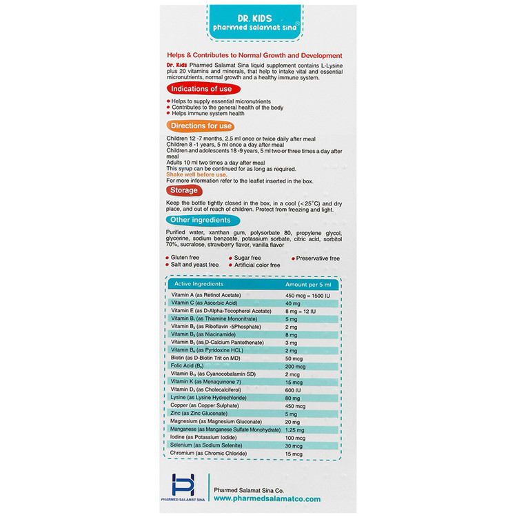 شربت دکتر کیدز فارمد سلامت سینا دارای اسید آمینه ضروری ال لیزین بعلاوه 200 نوع ویتامین و ماده معدنی است که مصرف آن برای کمک به تامین مواد مغذی ضروری، بهبود رشد و سلامت سیستم ایمنی توصیه می شود.ویتامین A نقش های مهم و حیاتی در بینایی، رشد، تولید مثل، تکامل استخوان، خونسازی و تکامل مغز دارد. این ویتامین برای عملکرد بهینه سیستم ایمنی نیز بسیار مهم است. بالاخص کودکان نسبت به اثرات کمبود ویتامین A حساس و آسیب پذیر هستند. کمبود این ویتامین منجر به شب کوری، تاخیر در رشد، خشکی و افزایش ضخامت پوست، و افزایش احتمال ابتلا به عفونت ها می شود.