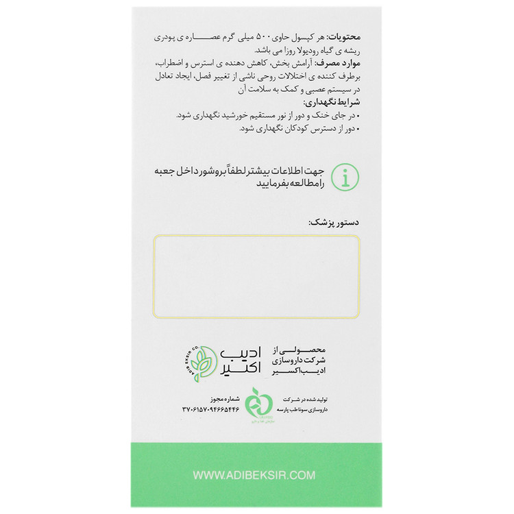 - هر کپسول حاوی 500 میلی گرم عصاره خشک ریشه گیاه رودیلا – روزا