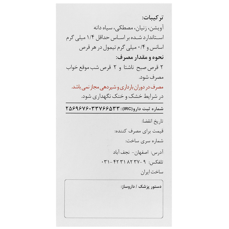 - استاندارد شده بر اساس حداقل 1.4 میلی گرم اسانس و 0.4 میلی گرم تیمول در هر قرص