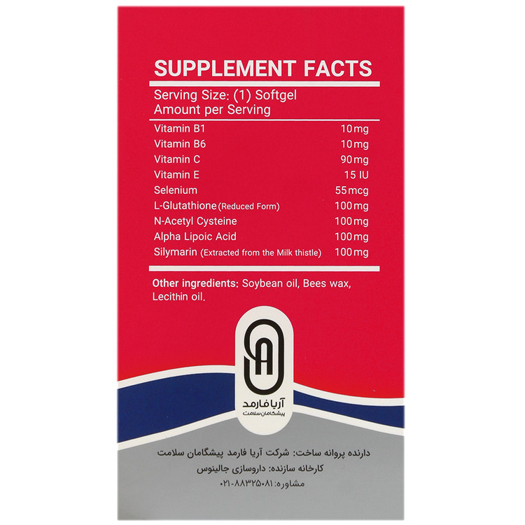 - حاوی ال گلوتاتیون، ان استیل سیستئین، آلفا لیپوئیک اسید، سیلی مارین، ویتامین ها و مواد معدنی