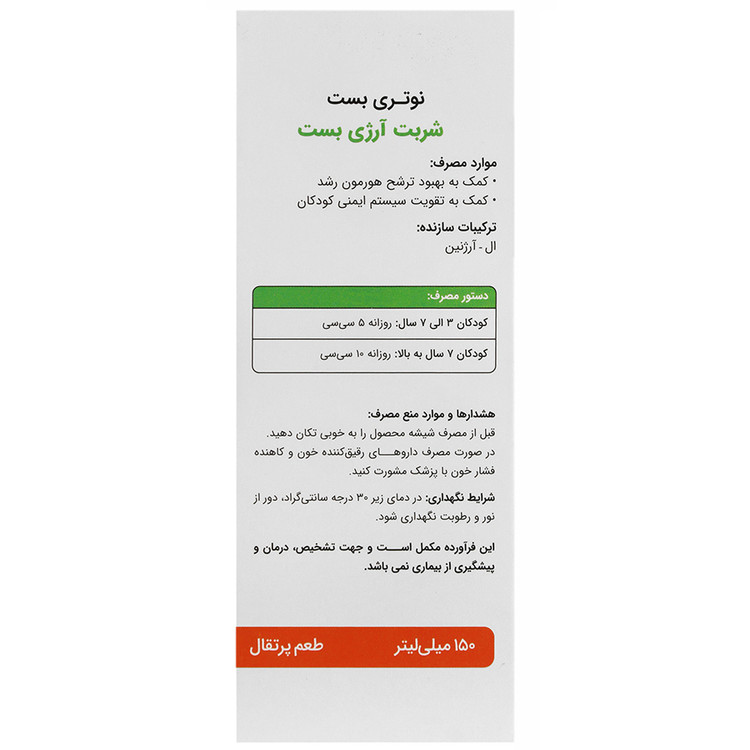 - شربت آرژی بست، حاوی 250 میلی گرم ال آرژنین به ازای هر 5 میلی لیتر