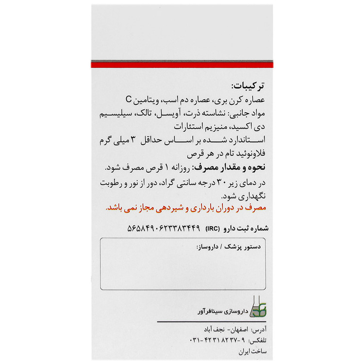 - حاوی عصاره کرن بری، عصاره دم اسب، ویتامین C ،نشاسته ذرت، آویسل، تالک، سیلیسیم دی اکسید و منیزیم استئارت