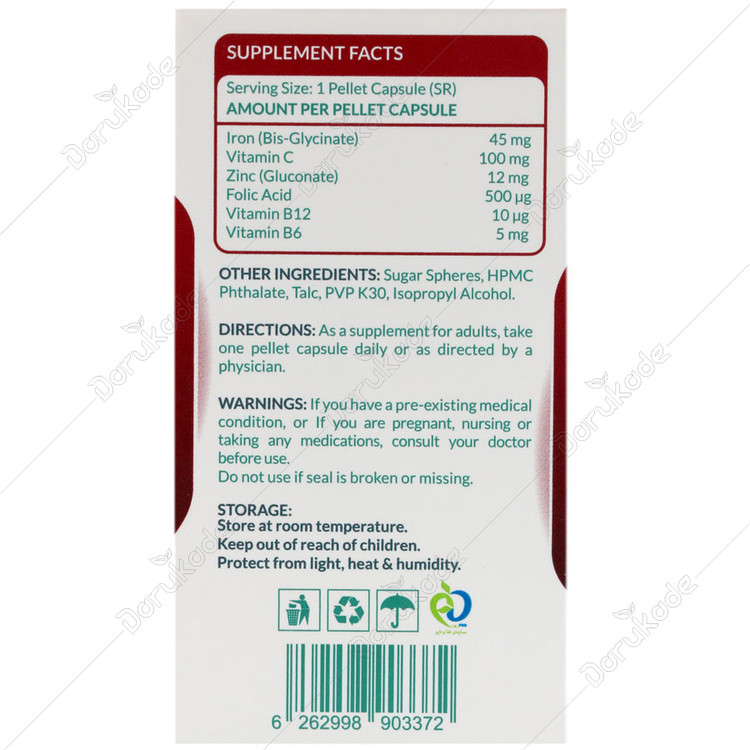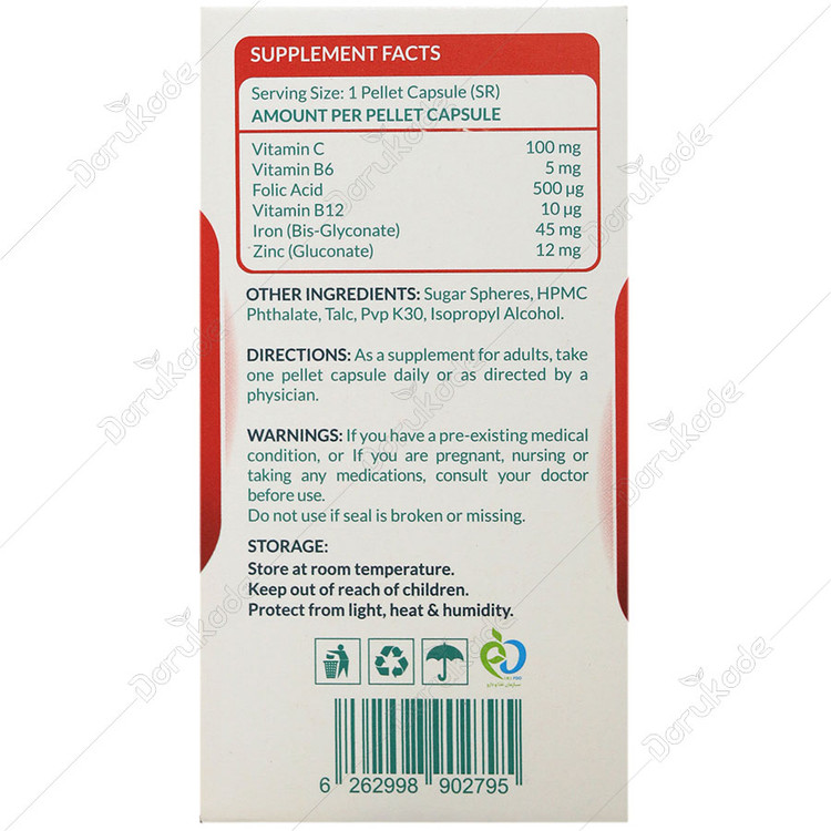 هشدار مصرف:- موارد احتیاط: مکمل های آهن نباید برای درمان آنمی غیر از آنمی فقر آهن استفاده شوند. درمان آنمی فقر آهن باید تحت نظارت پزشک باشد. در صورت مصرف همزمان با هر نوع دارو و یا در صورت ابتلا به هرگونه بیماری خاص و در دوران بارداری و شیردهی با پزشک متخصص مصرف شود. بیش از حد مجاز روزانه مصرف نشود. در صورت بروز حساسیت به مواد تشکیل دهنده از مصرف این مکمل خودداری شود. در صورت آسیب درپوش ظرف یا جعبه از مصرف خودداری شود.