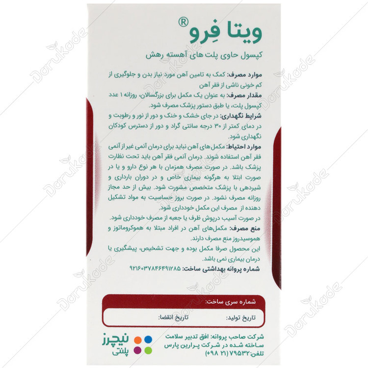 - کپسول ویتافرو، موثر بر تشکیل گلبولهای قرمز با فراهم کردن ویتامین B9 و B12