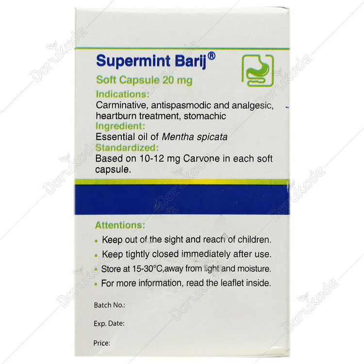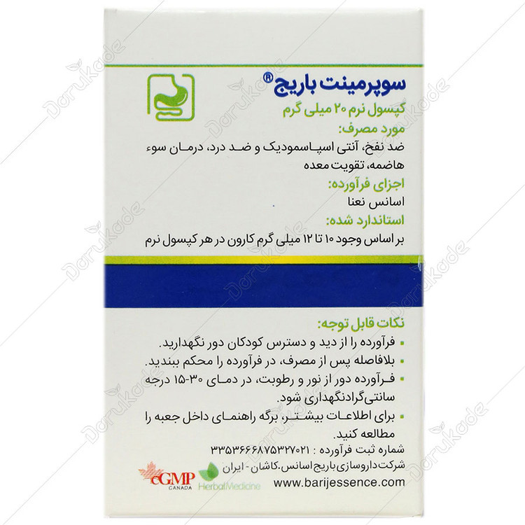 - حاوی اسانس نعنا (Mentha Spicata) حاوی 10 تا 12 میلی گرم کارون در هر کپسول نرم