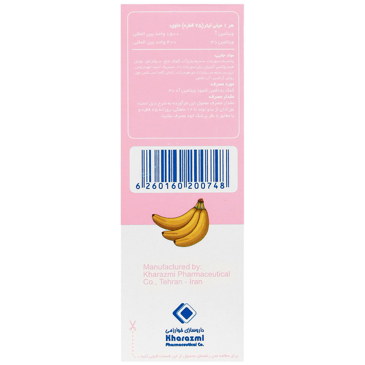 - هر میلی لیتر (25 قطره) حاوی 1500 واحد ویتامین آ پالمیتات و 400 واحد ویتامین د3