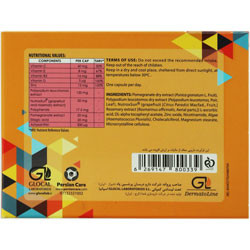 دارای ترکیباتی مانند عصاره انار، عصاره پلی پودیوم، عصاره گریپ فروت، عصاره رزماری، ویتامین C، ویتامین E، زینک اکساید، نیاسین آمید، آستازانتین، ویتامین D، منیزیم استئارات و سلولز میکروکریستالین