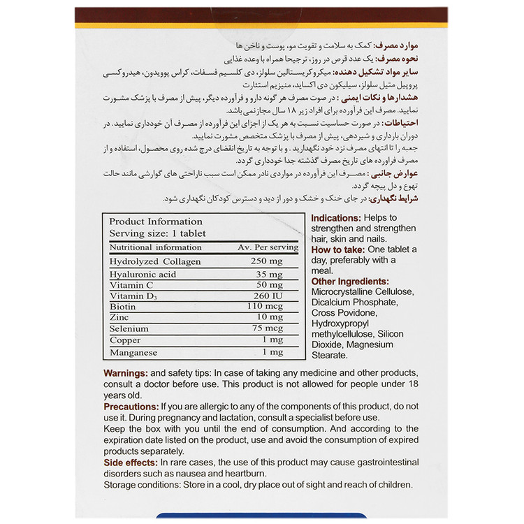 - عوارض جانبی: با توجه به دوز مصرف روزانه یک قرص، عوارض جانبی گزارش نشده است. ممکن است ادرار برخی افراد به دلیل متابولیسم ویتامین ها رنگ زرد نئونی داشته باشد که طبیعی و بی ضرر است و به مرور از بین می رود و علائم و عوارض دیگر شامل یبوست، اسهال، ناراحتی معده.