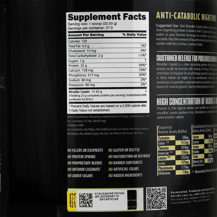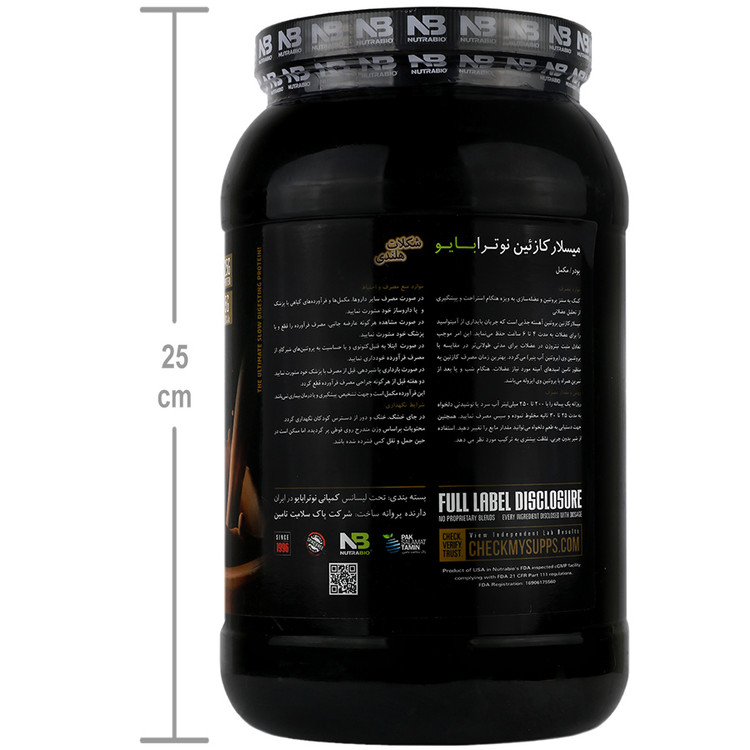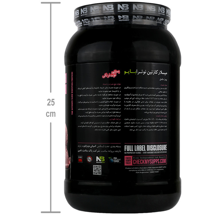 - میسلار کازئین نوترابایو حاوی 25 گرم پروتئین خالص به ازای هر پیمانه (معادل 32.5 گرم)