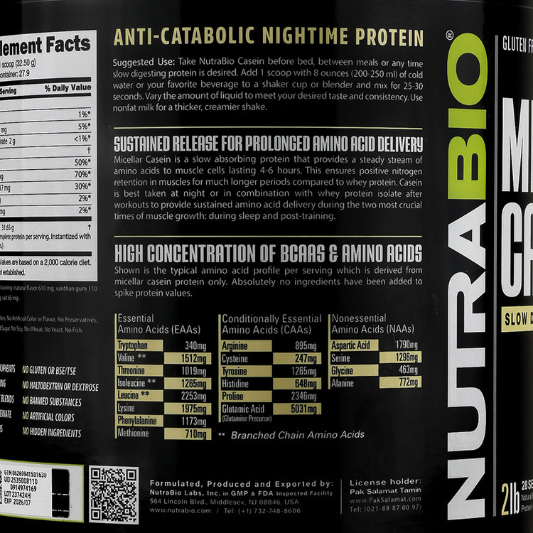 توضیحات:میسلار کازئین پروتئین آهسته جذبی است که جریان پایداری از آمینواسید را برای عضلات به مدت 4 تا 6 ساعت حفظ می نماید. این امر موجب تعادل مثبت نیتروژن در عضلات برای مدتی طولانی تر در مقایسه با پروتئین وی (پروتئین آب پنیر) می گردد. بهترین زمان مصرف کازئین به منظور تامین اسیدهای آمینه مورد نیاز عضلات، هنگام شب و یا بعد از تمرین همراه با پروتئین وی ایزوله می باشد.