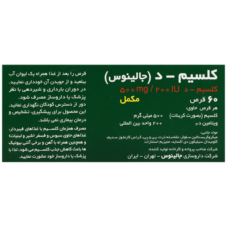 - حاوی 500 میلی گرم کلسیم و 200 واحد ویتامین D3