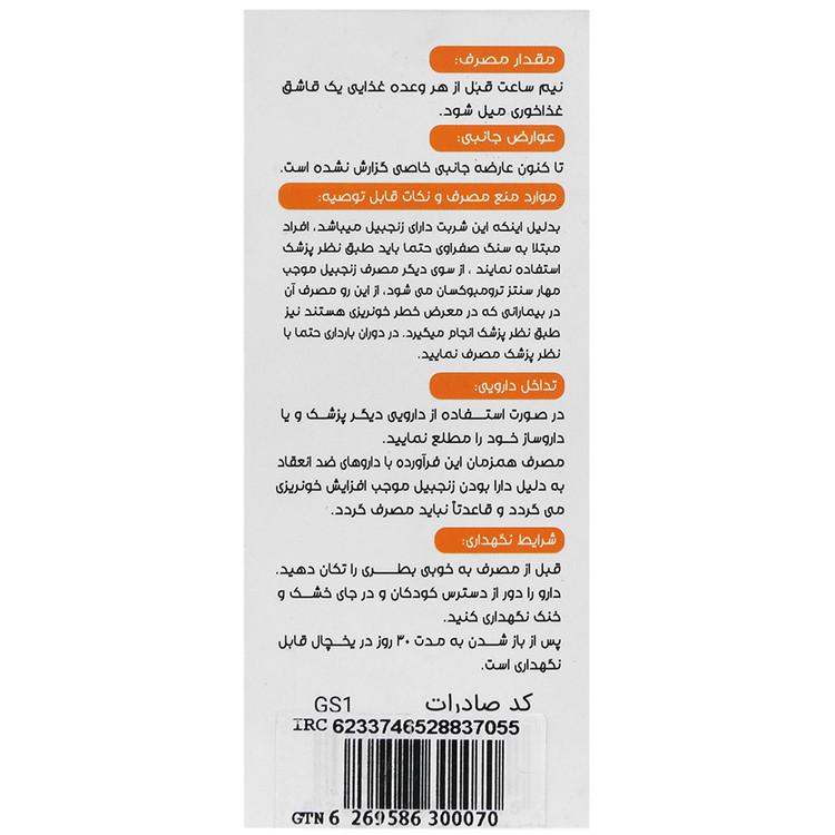 - موارد منع مصرف و نکات قابل توصیه: بدلیل اینکه این شربت دارای زنجبیل می باشد، افراد مبتلا به سنگ صفراوی حتما باید طبق نظر پزشک استفاده نمایند. از سوی دیگر مصرف زنجبیل موجب مهار سنتز ترومبوکسان می شود. مصرف آن در بیمارانی که در معرض خطر خونریزی هستند نیز طبق نظر پزشک انجام گیرد. در دوران بارداری حتما با نظر پزشک مصرف نمایید.