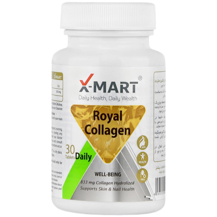 رویال کلاژن ایکس مارت حاوی 833 میلی گرم کلاژن هیدرولیز شده با کیفیت از نوع 1 و 3 است. در فرآیند هیدرولیزه شدن، کلاژن به قطعات کوچکتر تبدیل می شود تا به راحتی برای بدن قابل جذب باشد. مکمل رویال کلاژن ایکس مارت با تامین کلاژن و آبرسانی به لایه های مختلف پوست، ایجاد چین و چروک را به تاخیر انداخته و موجب تحریک رشد مو و ناخن می شود. رویال کلاژن حاوی کلاژن خالص بوده و کلاژن اصلی ترین ساختار تشکیل دهنده بافت پوست، مو و ناخن است که با افزایش سن، تولید این اکسیر جوانی در بدن کاهش پیدا می کند. کاهش تولید کلاژن از اصلی ترین عواملی است که باعث ایجاد نشانه های پیری می شود. هر قرص رویال کلاژن با اثر گذاری بالا، روند پیری پوست را متوقف کرده و باعث استحکام پوست، افزایش سرعت رشد و کاهش دفعات شکستگی ناخن می شود. همانطور که توضیح داده شد نیز در رویال کلاژن از کلاژن هیدرولیز شده استفاده شده است. کلاژن هیدرولیز شده به کلاژنی گفته می شود که به اندازه کوچکتر و قابل جذب تبدیل شده و جذب بسیار بالایی دارد.