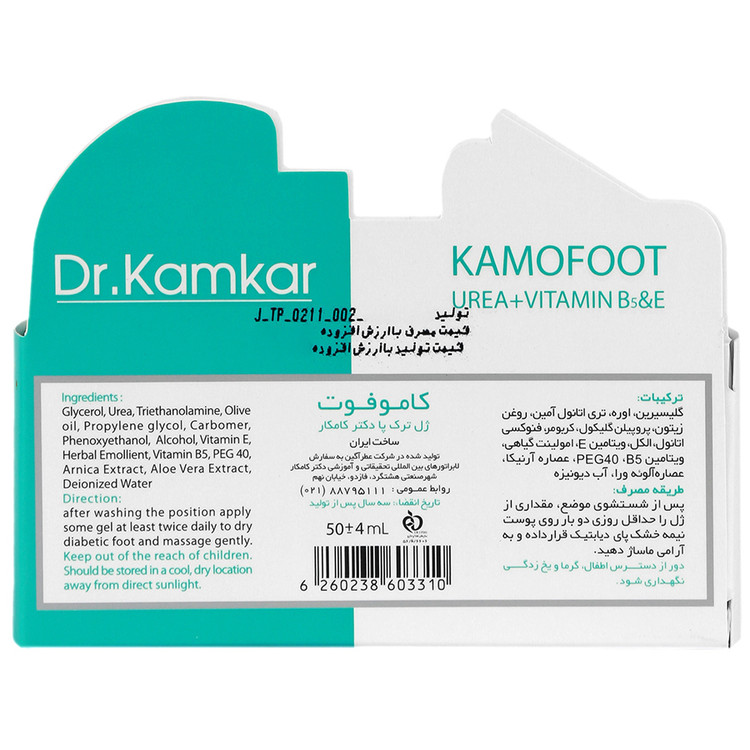 افزایش فشار و کشیدگی پوست باعث کاهش فیبرهای کلاژن و الاستین شده، در انسجام سلولی اختلال ایجاد کرده و با از بین رفتن الاستیسیته و انعطاف پذیری طبیعی پوست ترک خوردگی و ایجاد شیارهای پوستی را شاهد هستیم. اپیدرم لایه خارجی پوست دچار بریدگی شده که همان ترک پوستی تعریف می شود. عواملی همچون چاقی، اضافه وزن، غدد عرقی غیرفعال، یائسگی، بارداری، ایستادن برای مدت طولانی، پوشیدن کفش نامناسب، شرایط آب و هوایی، بالا رفتن سن و همچنین بیماری های مختلف نظیر دیابت و اگزما سبب تشدید این عارضه می شود. ژل ترک پا دکتر کامکار (ژل کاموفوت) با بهره گیری از هموکتانت ها، عصاره های گیاهی و ماده موثره اوره به عنوان ترمیم کننده، باعث افزایش ظرفیت جذب و نگهداری رطوبت می شود. این محصول دارای خاصیت پوشانندگی قوی، رفع خشکی و کشیدگی پوست و همچنین افزایش رطوبت و خواص بیومکانیکی پوست می گردد.اوره: اوره یا کاربامید یک ترکیب آلی است که حدود 250 سال پیش توسط هیلاری رول در بدن جانداران کشف شد. آبرسانی اوره به گونه ای است که رطوبت محیط را جذب و وارد پوست می کند. از این رو تاثیر بسیار زیادی در درمان دهیدراته بودن پوست و حتی خشکی های شدید پوست دارد. همچنین اوره یکی از موارد اکتیو مرطوب کننده است که به طور طبیعی در بدن انسان توسط کبد تولید می شود و در خون نیز وجود دارد. کراتولیتیک درمانی برای حذف ضایعات پوستی می باشد که در آن سلول لایه شاخی پوست افزایش پیدا می کند. اوره به عنوان کراتولیتیک عمل کرده که دارای خاصیت لایه برداری قوی می باشد و سلول های مرده را حذف می کند.