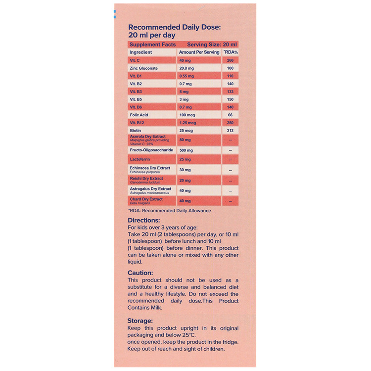 برای کودکان بالای 3 سال، روزانه 2 قاشق غذاخوری (20 میلی لیتر)، یا 1 قاشق غذاخوری (10میلی لیتر) قبل از ناهار و 1 قاشق غذاخوری (10 میلی لیتر) قبل از شام میل گردد. این شربت میتواند به تنهایی یا همراه مایعات دیگر مصرف شود.