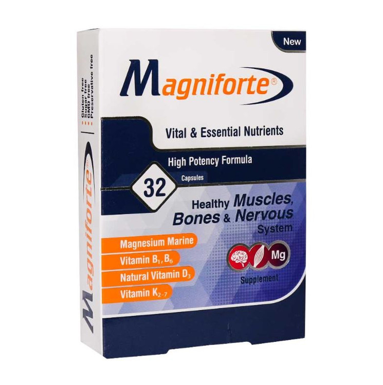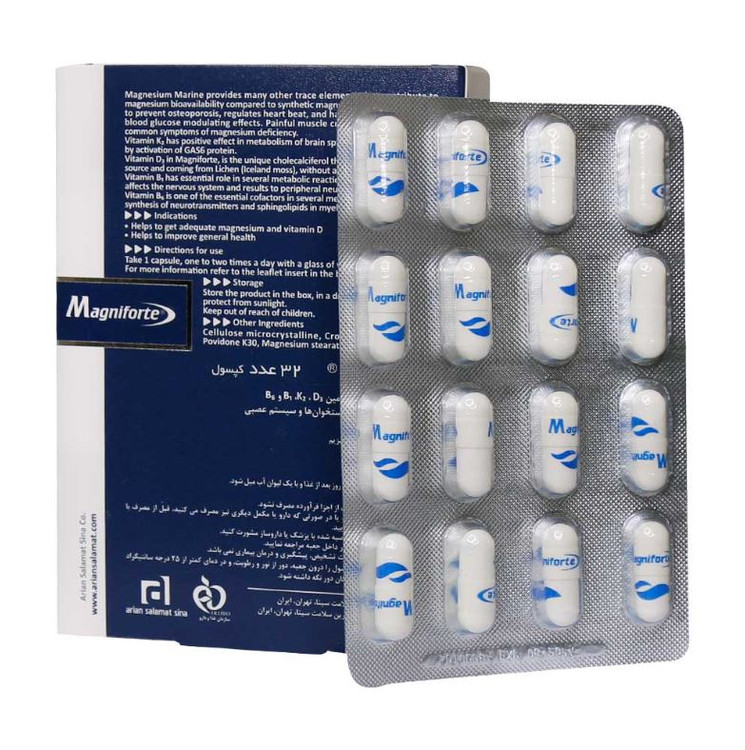 منیزیم منیزیم یک ماده معدنی ضروری در تغذیه انسانها میباشد که عملکردهای بیولوژیکی بسیار وسیعی دارد. حدود 60% منیزیم کل بدن در استخوان ها قرار دارد. منیزیم در بیش از 300 واکنش متابلیک شرکت میکند. وجود این ماده برای انجام فرآیندهای بیولوژیکی اصلی مانند تولید انرژی سلولی، تولید اسیدهای نوکلئیک و پروتئینها ضروری است. علائم و نشانههای کمبود منیزیم عبارتند از: کاهش اشتها، تهوع و استفراغ، اسهال، اسپاسم عمومی عضلانی، تشنجهای موضعی و عمومی، از دست دادن هماهنگی بین ارگانهای مختلف بدن، نامنظمی ضربانات قلبی، اختلالات آزمایشگاهی مانند کاهش پتاسیم و کلسیم، کرامپهای عضلانی، افزایش فشارخون و انقباض عروق قلبی و عروق مغزی. کمبود منیزیم در مادران باردار، بیماران دیابتی، اختلالات جذب، مصرف کنندگان الکل، پرکاری تیروئید و مصرف کنندگان برخی داروها مثل داروهای مدر بطور بسیار شایع وجود داشته و سبب بروز عوارض و اختلالات مهم می شود. بنابراین دریافت منیزیم کافی از رژیم غذایی و یا از طریق مکمل ها برای پیشگیری و بهبود اختلالات فوق توصیه می شود. منیزیم موجود در مکمل مگنیفورت منشا دریایی دارد و از آب دریا تخلیص شده است. منیزیم دریایی همراه با 90 ریزمغذی دیگر است که بعنوان کوفاکتور در انجام واکنشهای بیولوژیک بدن ضروری هستند. نوع ملح منیزیم دریایی با داشتن 60% زیست فراهمی، بالاترین رقم جذب را در بین سایر انواع ملح منیزیم دارا میباشد. همچنین وجود ریزمغذیهای دیگر همراه با منیزیم دریایی سبب افزایش زیست فراهمی یکدیگر میشوند. دریافت منیزیم کافی علاوه بر پیشگیری از کرامپهای دردناک عضلانی و پوکی استخوان، علائم PMS و یبوست را نیز کاهش میدهد. ویتامین B (تیامین) ویتامین B از ویتامین های محلول در آب است که اولین بار به عنوان عامل ضد بیماری بری بری معرفی شد. این ویتامین به نام تیامین نیز نامیده شده است. تیامین نقش اساسی در سوخت و ساز قندها و عملکردهای سیستم عصبی دارد. تیامین بطور گسترده در بسیاری غذاها ولی در مقادیر اندک وجود دارد. غنی ترین منابع مخمرها و جگر است، و مهم ترین منبع تیامین دانه های غلات کامل و فرآوری نشده است. جدا کردن سبوس غلات و اصطلاحاً سفید کردن برنج و گندم سبب از بین رفتن تیامین آن ها می شود. حرارت، اکسیداسیون و اشعه های یونیزه کننده نیز سبب تخریب تیامین می شوند، ولی تیامین به انجماد مقاوم است. کمبود تغذیه ای تیامین با بی اشتهایی، کاهش وزن و علائم قلبی و عصبی مشخص می شود. در انسان کمبود تیامین منجر به بیماری بری بری می شود که با علائم اغتشاش ذهنی، ضعف عضلات، ادم، نوروپاتی محیطی، تاکیکاردی و بزرگی قلب همراه است. این بیماری بویژه در مناطق فقیر جهان که غذای عمده آن ها برنج سفید شده است بیشتر شایع است. همچنین در مصرف کنندگان الکل، افراد مسن و بیمارانیکه بطور طولانی مدت داروهای مدر کاهنده فشار خون مصرف کرده اند، کمبود تیامین اغلب دیده می شود. کمبود این ویتامین سیستم عصبی را درگیر کرده و منجر به نوروپاتی محیطی می شود که علائم آن شامل احساس گزگز در انگشتان پا، سوزش و درد پاها، حساسیت و کرامپ عضلات ساق پا و سختی بلند شدن از حالت چمباتمه می باشد. ویتامین B (پیریدوکسین) ویتامین B نیز از گروه ویتامین های B و محلول در آب است. پیریدوکسین بطور عمده در سوخت و ساز پروتئین ها نقش دارد. این ویتامین بطور گسترده در غذاها وجود دارد که عمدتاً شامل گوشت ها، غلات کامل، سبزیجات و دانه های آجیل می باشد. به نظر می رسد منابع حیوانی زیست فراهمی بیشتری دارند. مصرف مداوم و بیش از حد الکل می تواند از طریق افزایش تخریب، منجر به کمبود ویتامین B? شود. همچنین مصرف برخی داروها مانند ایزونیازید، کاربامازپین و غیره نیز نیاز به این ویتامین را افزایش می دهند. کمبود این ویتامین منجر به اختلالات متابلیک می گردد. این اختلالات به صورت تغییرات بالینی پوستی و عصبی مانند ضعف، بیخوابی، نوروپاتی های محیطی، ترک و پوسته پوسته شدن لب، التهاب زبان و دهان، نوع خاص