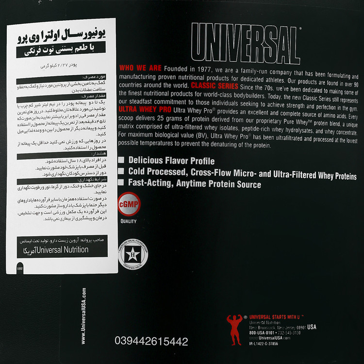 - مکمل اولترا وی پرو یونیورسال نوتریشن در وزن 2.27 کیلوگرم عرضه شده است.