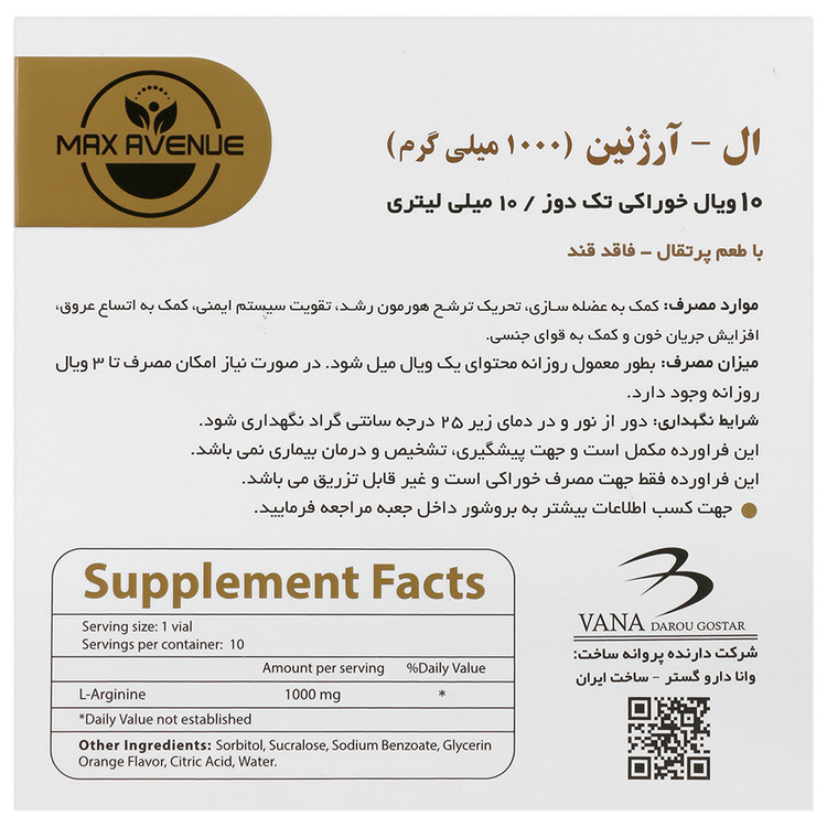 - ال آرژنین max avenue، حاوی 1000 میلیگرم ال آرژنین به ازای هر ویال