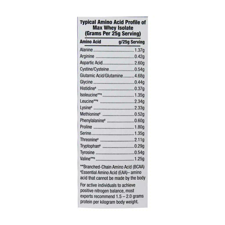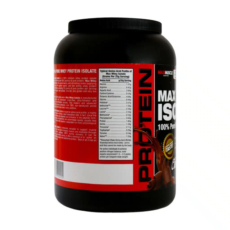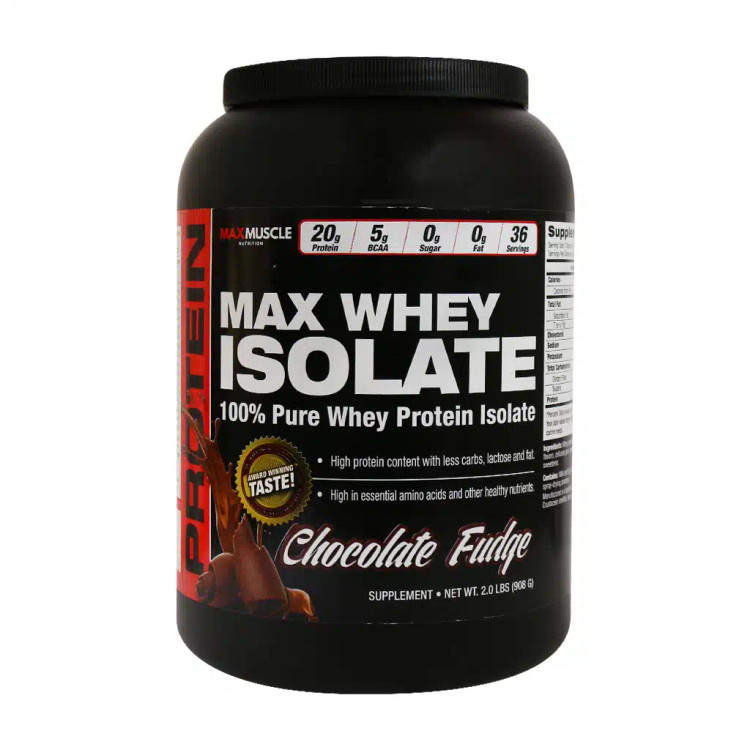 پروتئین وی ایزوله مکس ماسل یک پروتئین صدر صد ایزوله و بسیار زود جذب است. این محصول فقط از پروتئین ایزوله وی ساخته شده است، درنتیجه ورزشکارانی که به لاکتوز شیر حساسیت دارند، این محصول کمترین آثار سو را دارد. این مکمل در بسته بندیهای ۹۰۰ گرمی عرضه میشود، که دارای ۳۶ پیمانه ۲۵ گرمی است. هر پیمانه ۲۵ گرمی آن شامل ۲۰ گرم پروتئین، ۳ گرم کربوهیدرات، ۹۲ کالری و چربی کل صفر است. ورزشکارانی که در دوران رژیم به سر میبرند و به دنبال یک مکمل پروتینی رژیمی هستند، این محصول یک انتخاب مناسب است.