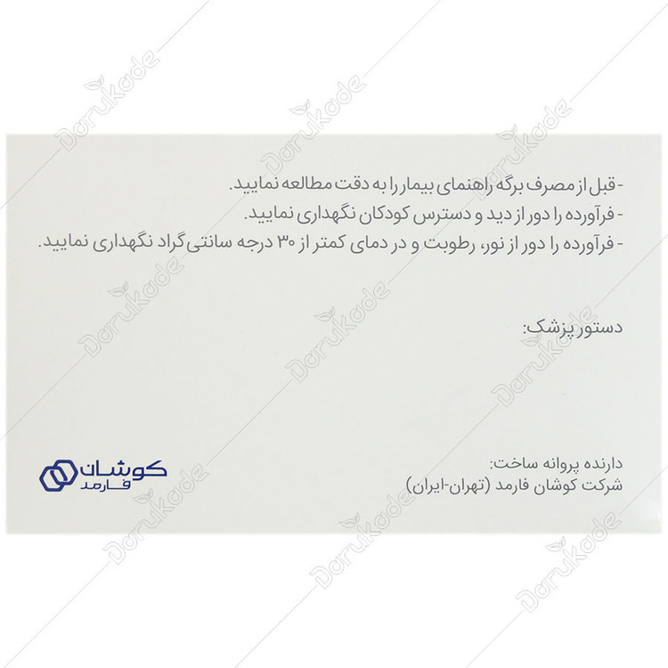 - فرآورده را دور از نور، رطوبت و در دمای کمتر از 30 درجه سانتی گراد نگهداری نمایید. فرآورده را دور از دید و دسترس کودکان نگهداری نمایید.