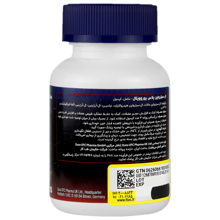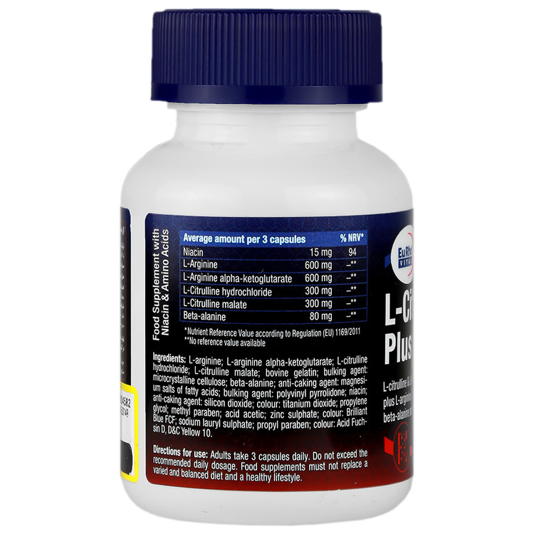 کپسول ال-سیترولین پلاس یوروویتال حاوی ال-سیترولین مالات، ال-سیترولین هیدروکلراید، ال-آرژینین، ال-آرژینین آلفا-کتوگلوتارات، بتا آلانین و نیاسین است که به افزایش حجم عضلانی، ارتقای عملکرد ورزشی، بهبود ریکاوری عضلات، کاهش احساس خستگی و افزایش قدرت بدنی کمک میکند.